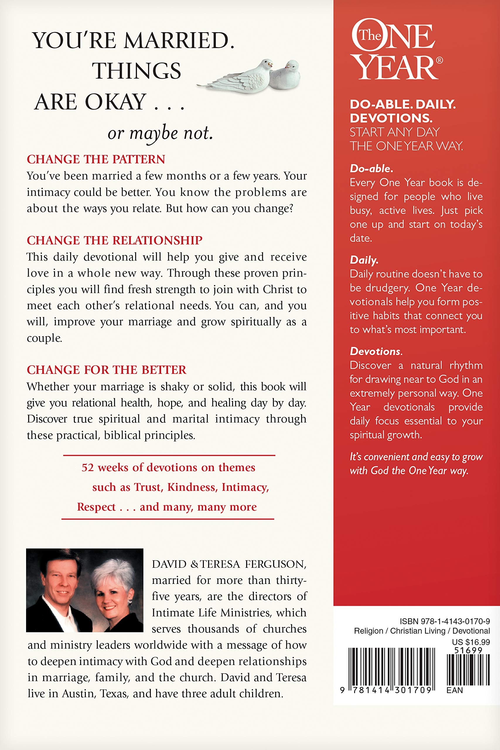 The One Year Devotions for Couples will help you give and receive love in a whole new way. Through the proven principles in this devotional, you will find fresh strength and new inspiration to meet your spouse’s relational needs. David and Teresa Ferguson, cofounders of Intimate Life Ministries, are seasoned counselors who can guide you toward better relational health. You can―and you will―improve your marriage and grow spiritually as a couple.