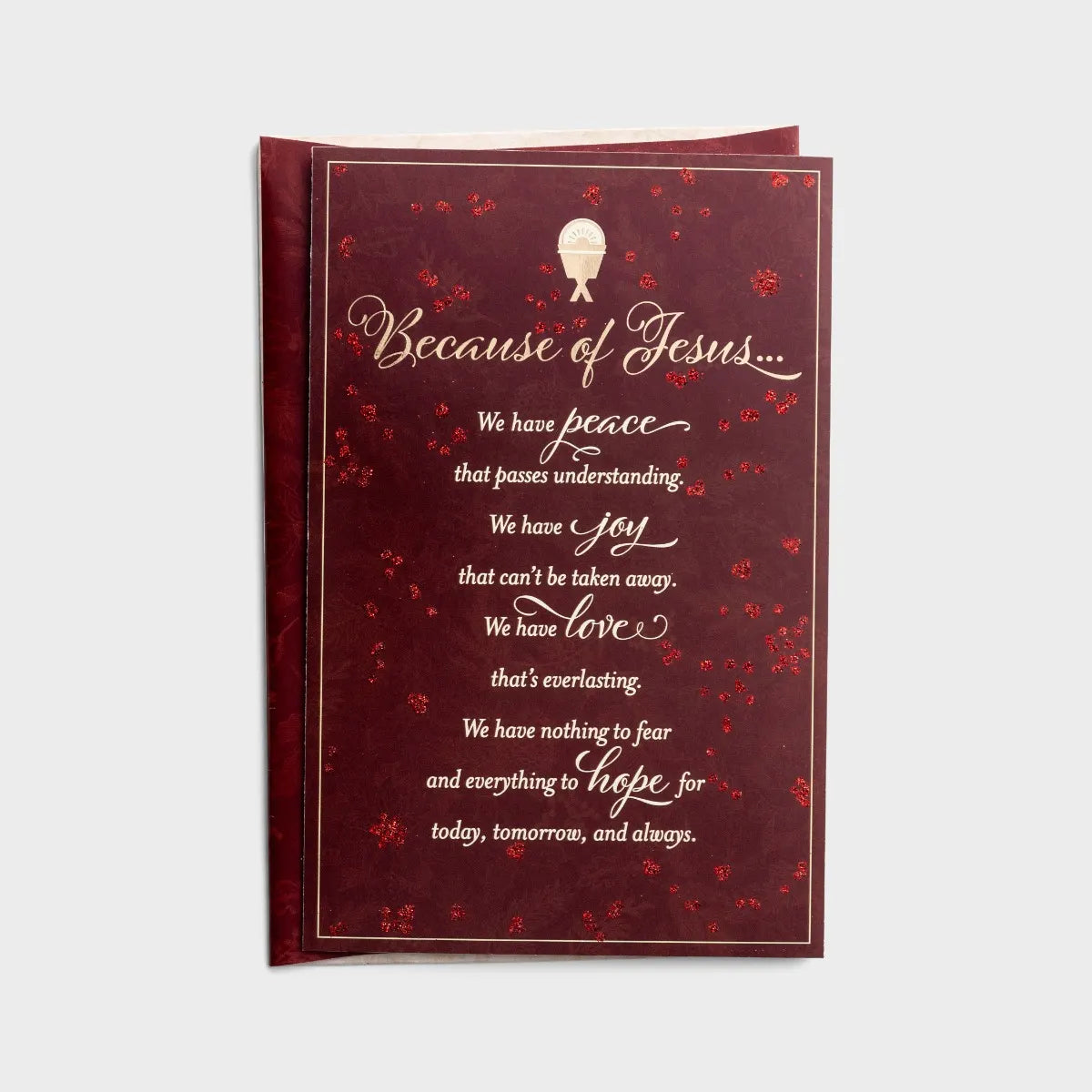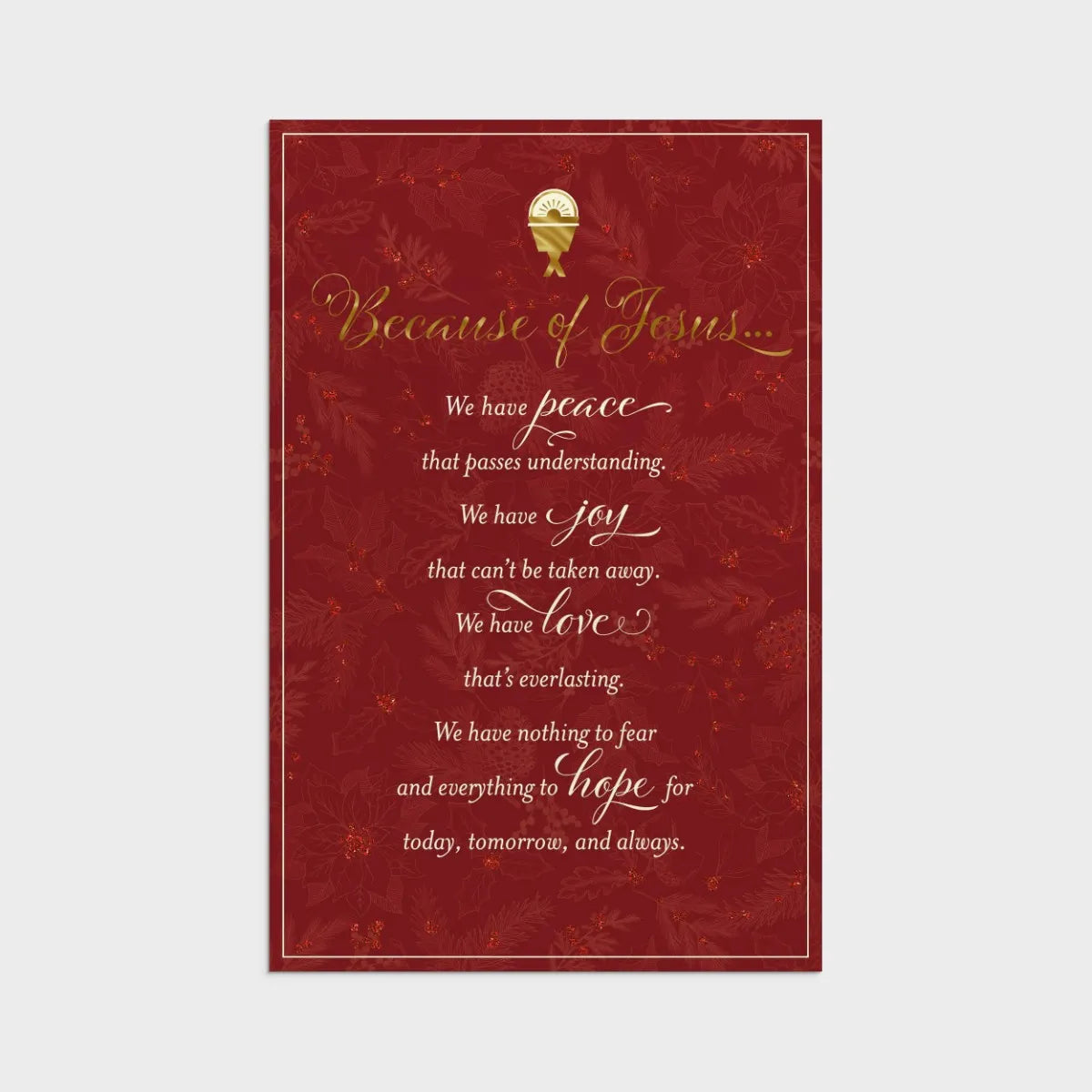 Front: Because of Jesus... We have peace that passes understanding. We have joy that can't be taken away. We have love that's everlasting. We have nothing to fear and everything to hope for today, tomorrow, and always.