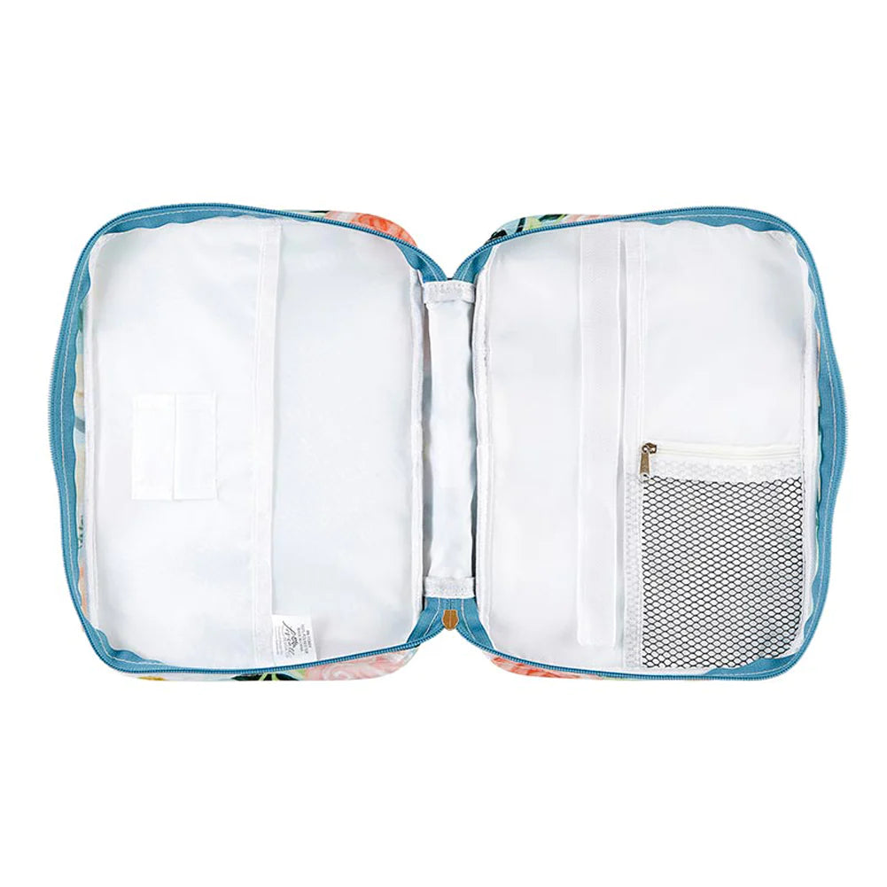 Two small zippered pockets appear on the front and back panels and can be used to store small items such as Kleenex, a small notebook, or papers. The gold metal zipper pulls have round medallions engraved with a cross. An attached lay-flat spine handle, constructed from the same silky smooth navy nylon, allows the Bible cover to open fully when in use. On the inside of the Bible case are two pen loops to keep a pen or highlighter handy.