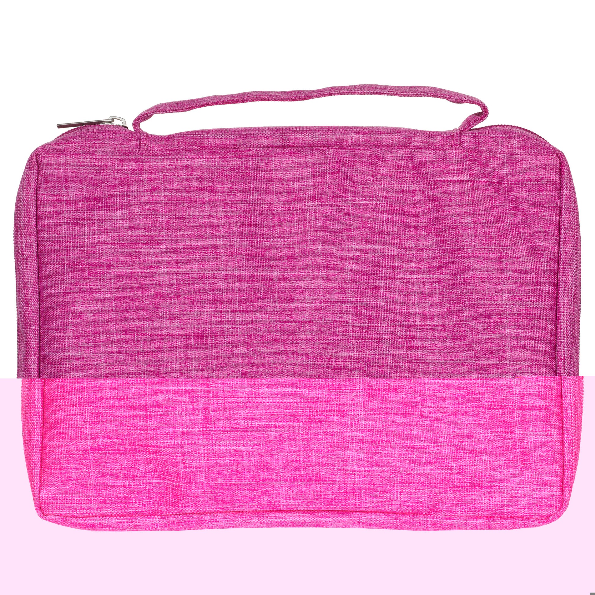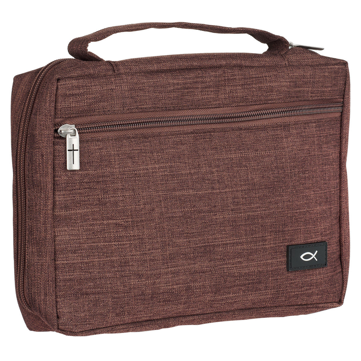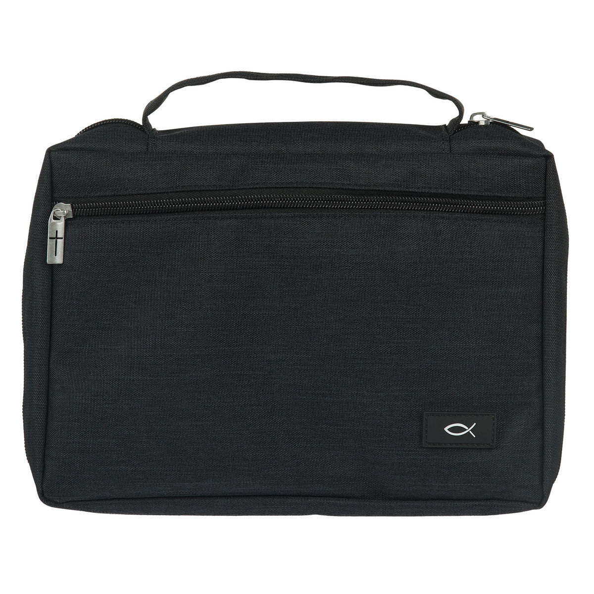 A zippered pocket on the front panel has a brushed silver metal zipper pull engraved with a cross design. To ensure the Bible opens all the way flat, the lay-flat black poly-canvas spine handle folds entirely away.