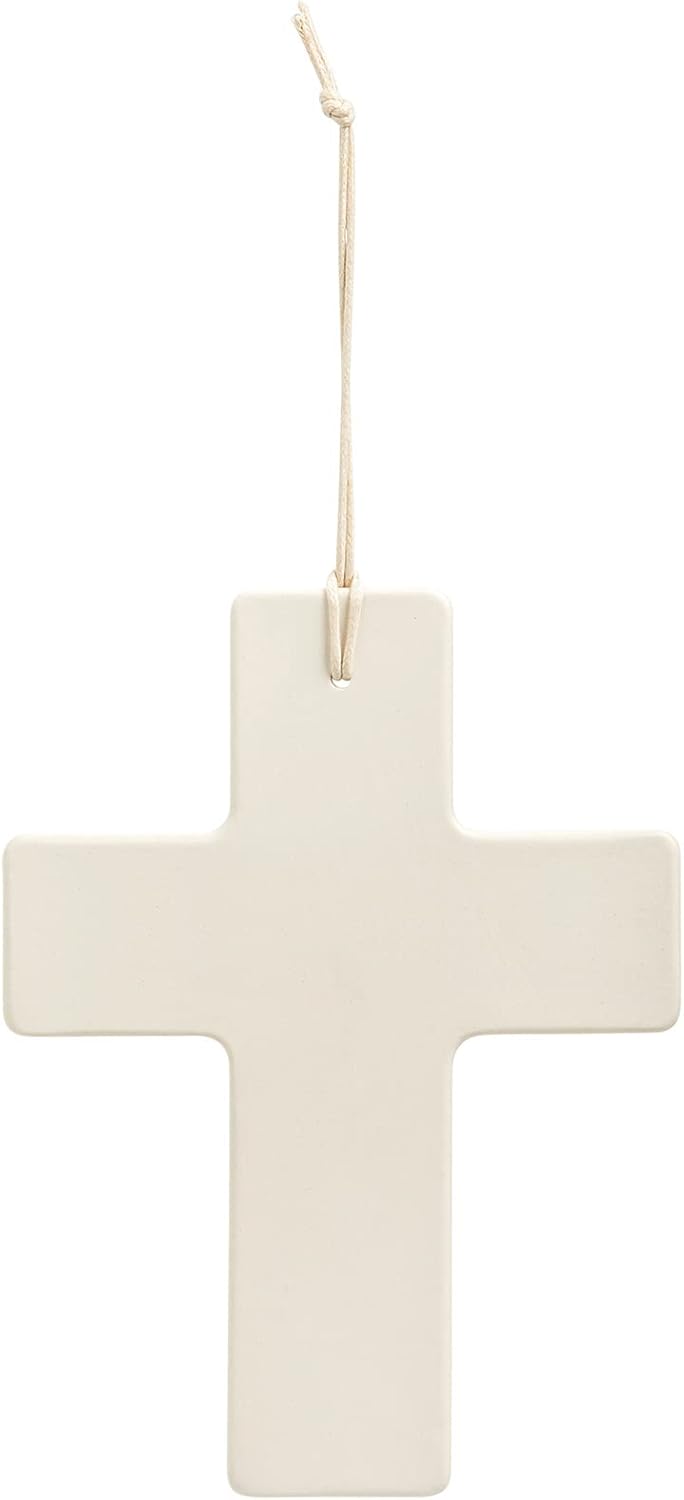 - Cross is made of glossy ceramic stoneware with a classic white and soft pink finish; Accented by a shimmering silver charm, raised dots, and a sculpted border