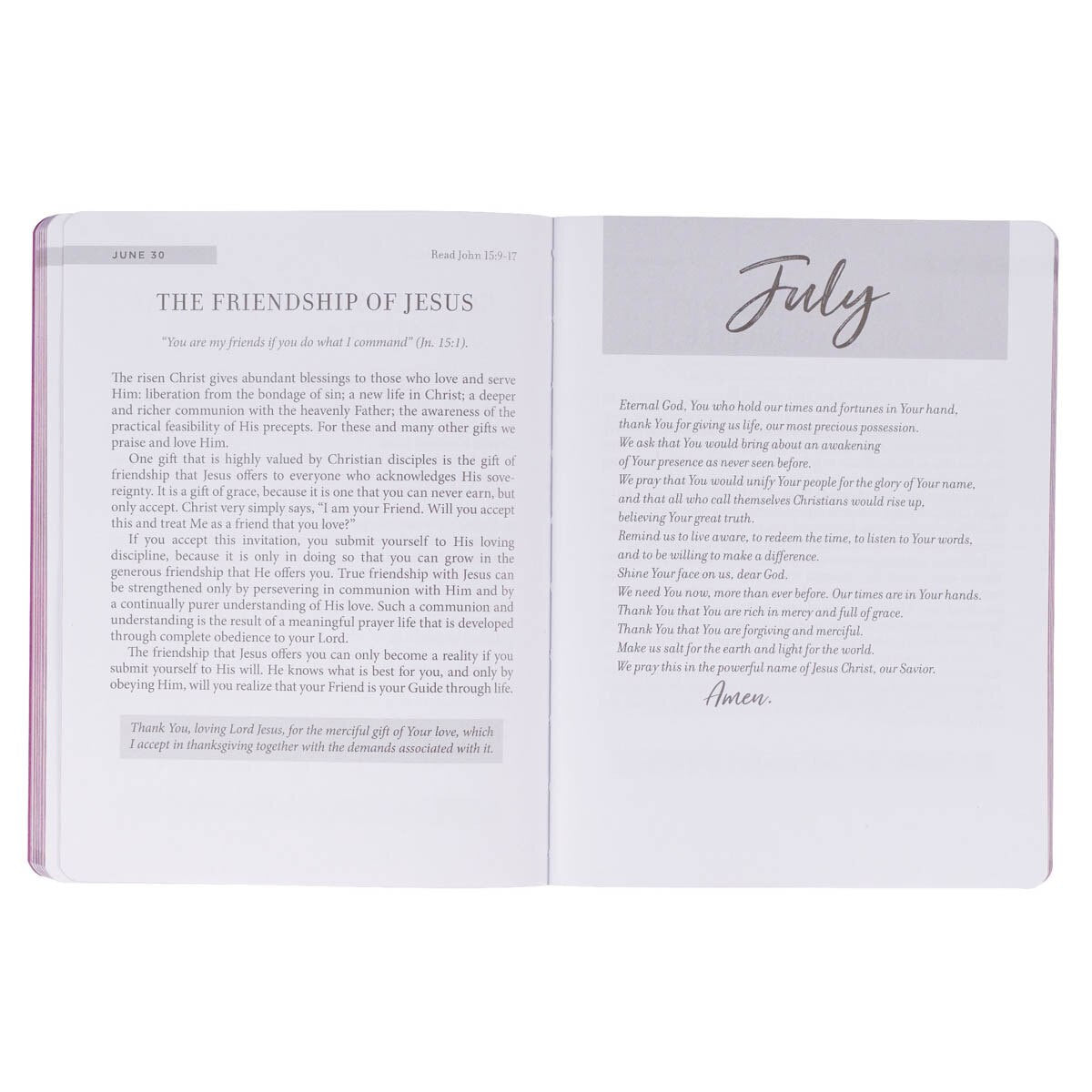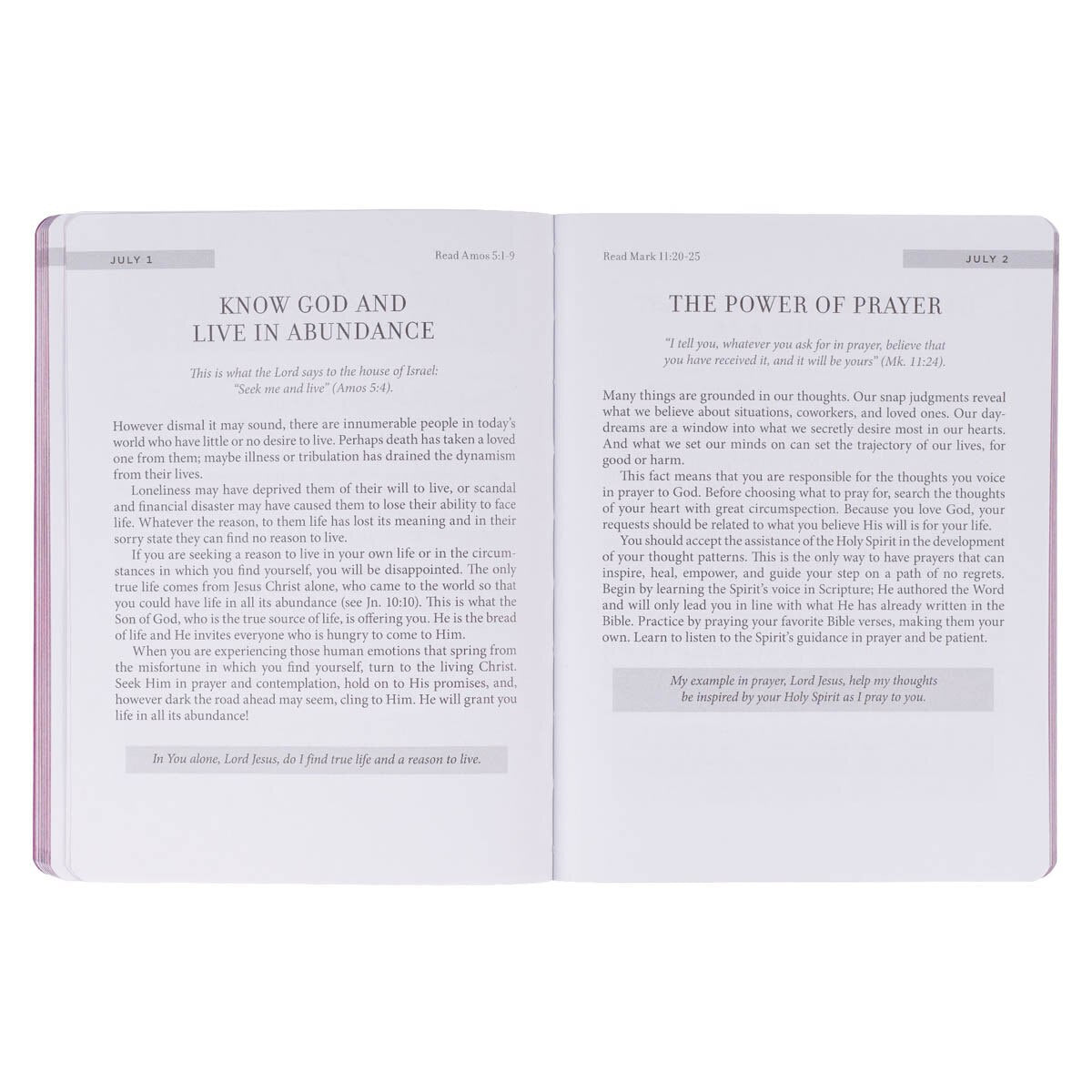 The gilt-edged pages add additional shimmer to the devotional and elevate the softcover binding. A second luxury feature is a satin ribbon marker that is attached to the spine.