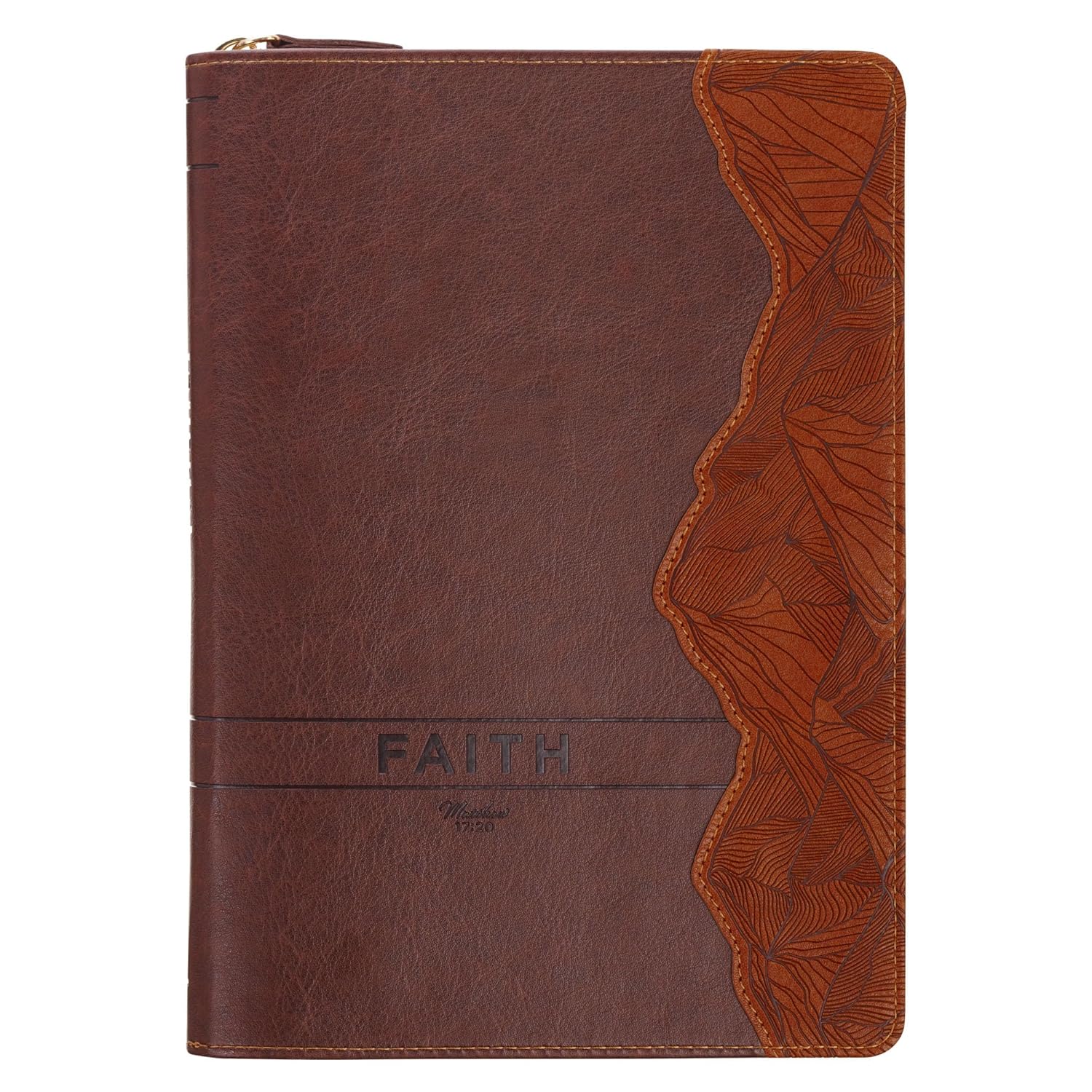 As part of the Faith Mountain Summit Collection, the Faith Chestnut Brown Faux Leather Classic Journal with Zipper Closure Is sure to encourage and uplift any man who receives it. Consider pairing this journal with other items in this collection, such as a Bible cover, spiral journal, stainless steel travel tumbler, stainless steel water bottle, puzzle, gift bag, bookmark, ceramic mug, pen, and a Box of Blessings.