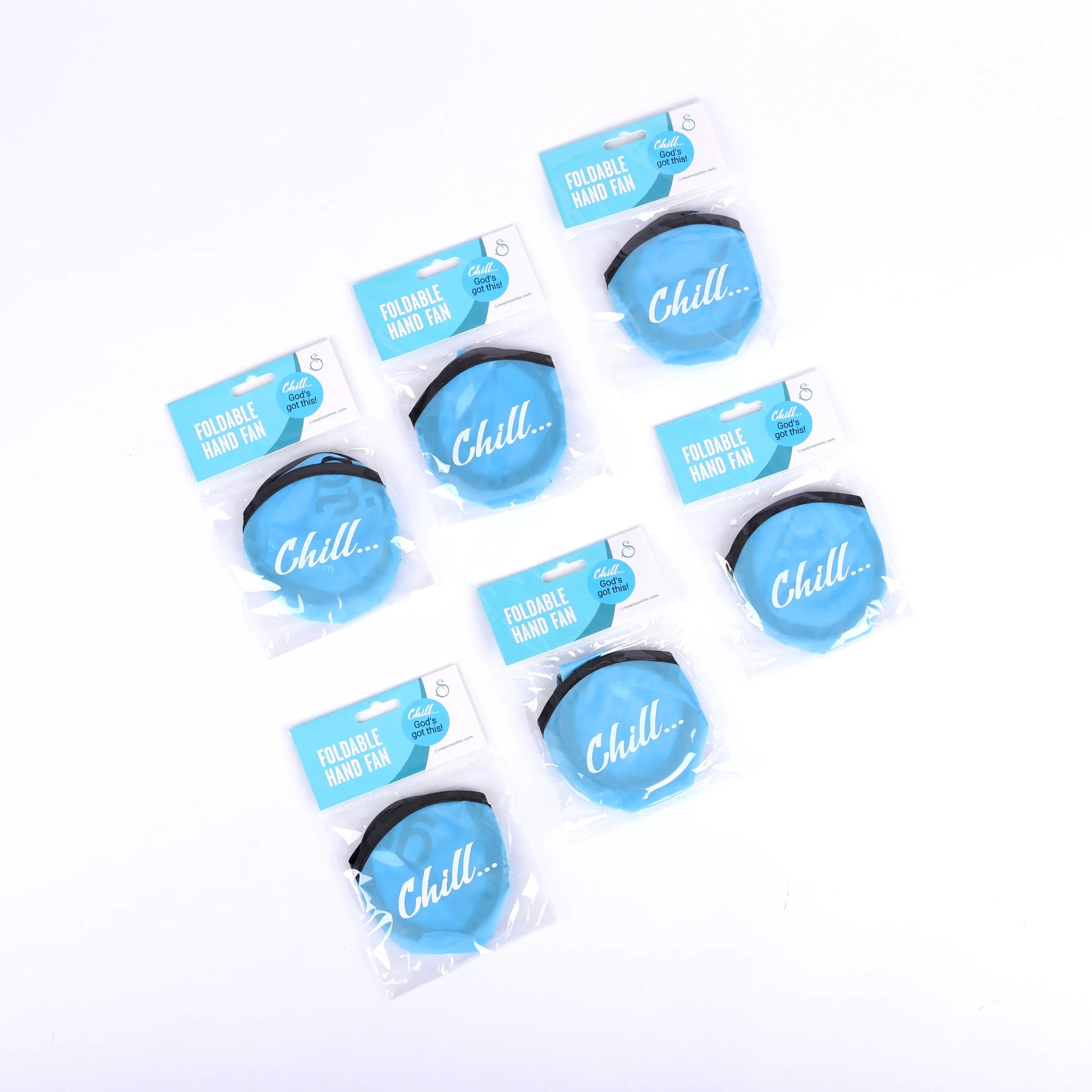 With a screen-printed design this "Chill, God's Got This" foldable fan is sure to make a delightful addition to any event. Printed on a bright blue background, the black and white lettering creates a clean and polished look. The black border around the fan helps to make the design pop and also reinforces the wire framing.