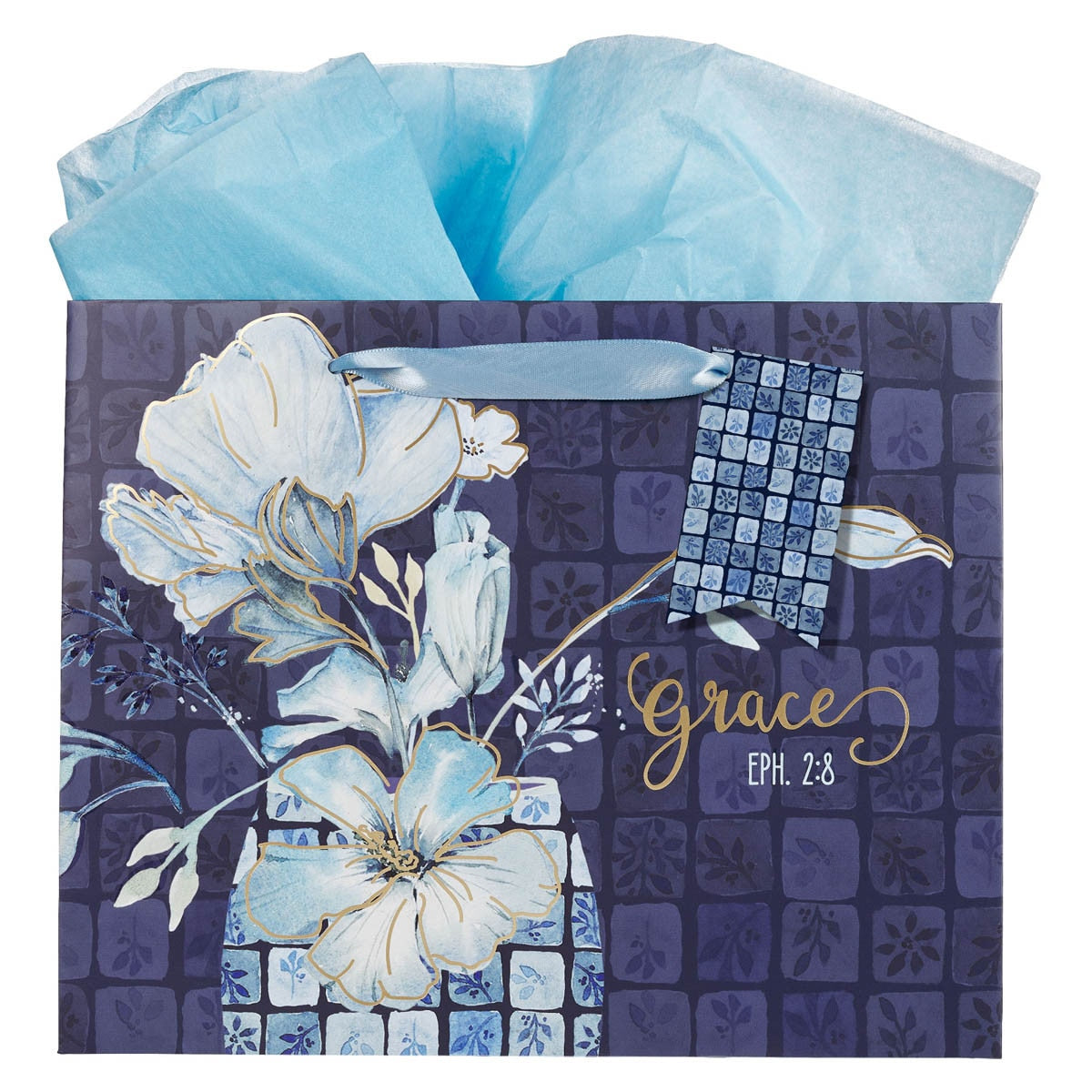 Grace Blue Floral Tile Large Landscape Gift Bag - Ephesians 2:8