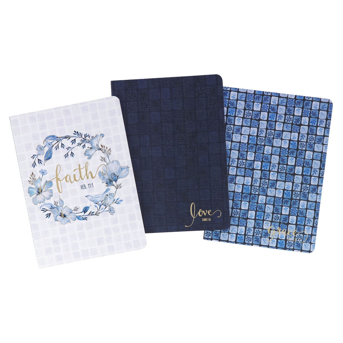This notebook set is designed around an enchanting blue floral tile design. The design is paired with Scripture that illuminates three fundamental principles of the Christian faith: Faith, Love, and Grace.