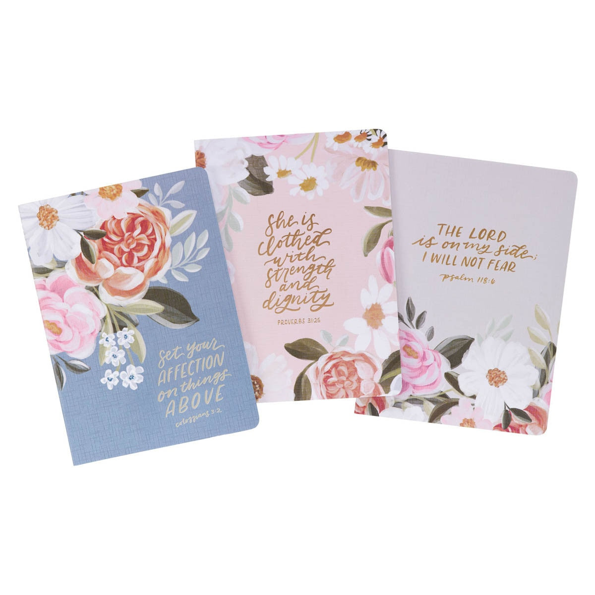 Affection Blue Floral Notebook Set, 3 notebooks with 64 lined pages each, silver & rose gold foil, perfect for Bible study notes, reflections, and more.