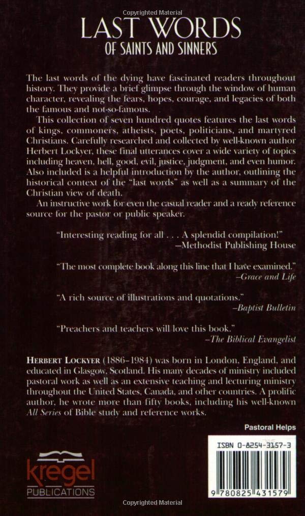 The last words of the dying have fascinated readers throughout history. They reveal the fears, hopes, courage, and legacies of both the famous and not-so-famous. This collection of seven hundred quotes includes the last words of commoners, atheists, poets, and politicians along with noted Christians and martyrs. Excellent for casual reading and as a ready reference source for the pastor or public speaker.