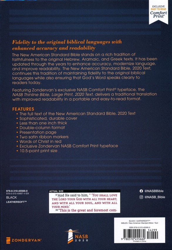 Featuring Zondervan’s exclusive NASB Comfort Print® typeface, the NASB 2020 Thinline Bible, Large Print delivers a traditional translation with improved readability in a portable and easy-to-read format.