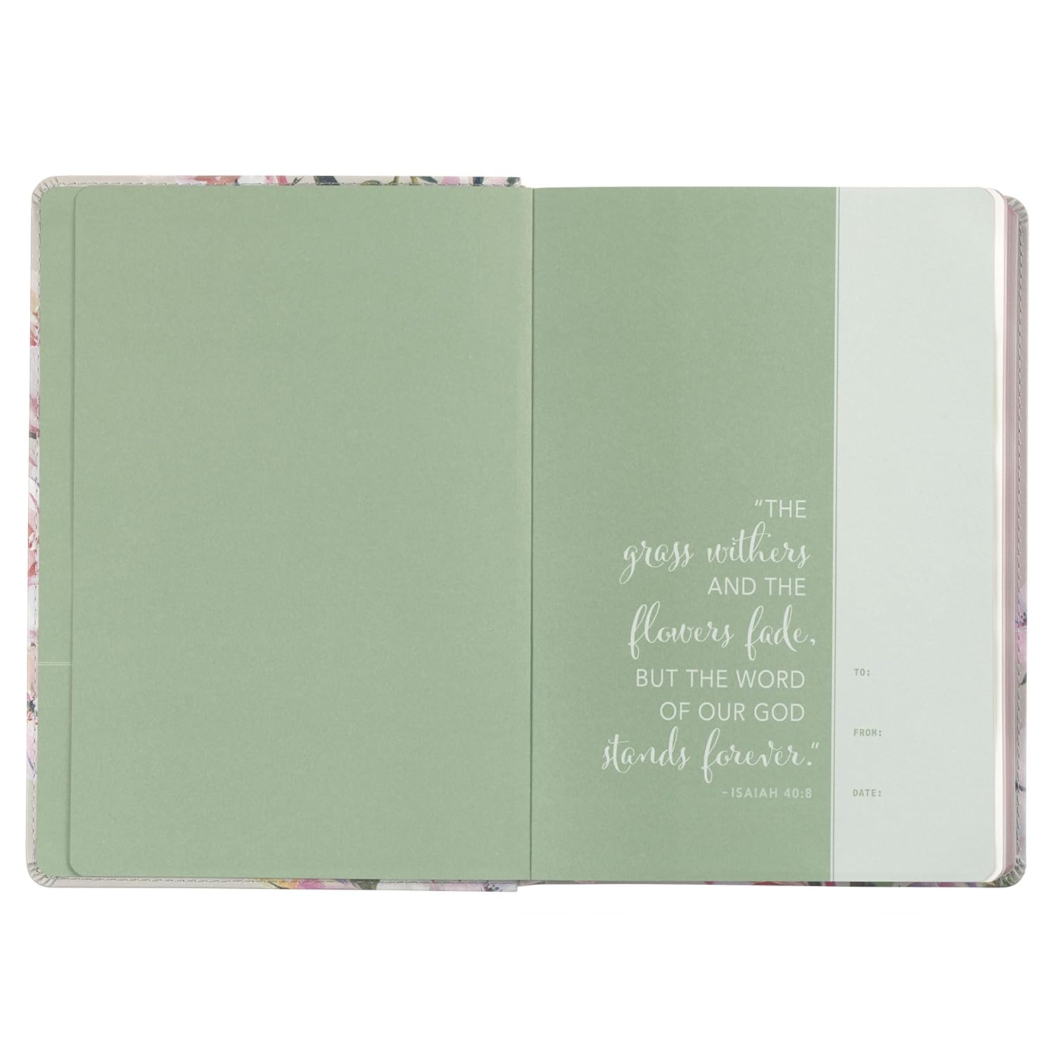 The devotional Bible features a light gray pearlized cover screen-printed with an enchanting pink floral watercolor design that encircles the pink-foiled title.