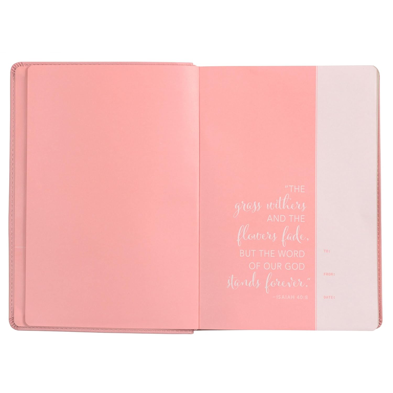 On the front of its sunrise pink faux leather cover, the devotional Bible showcases an exquisite abstract branch adorned with heat-debossed leaves and florals, all gracefully outlined in shimmering gold foil. Just to the right of the branch is the heat-debossed title.