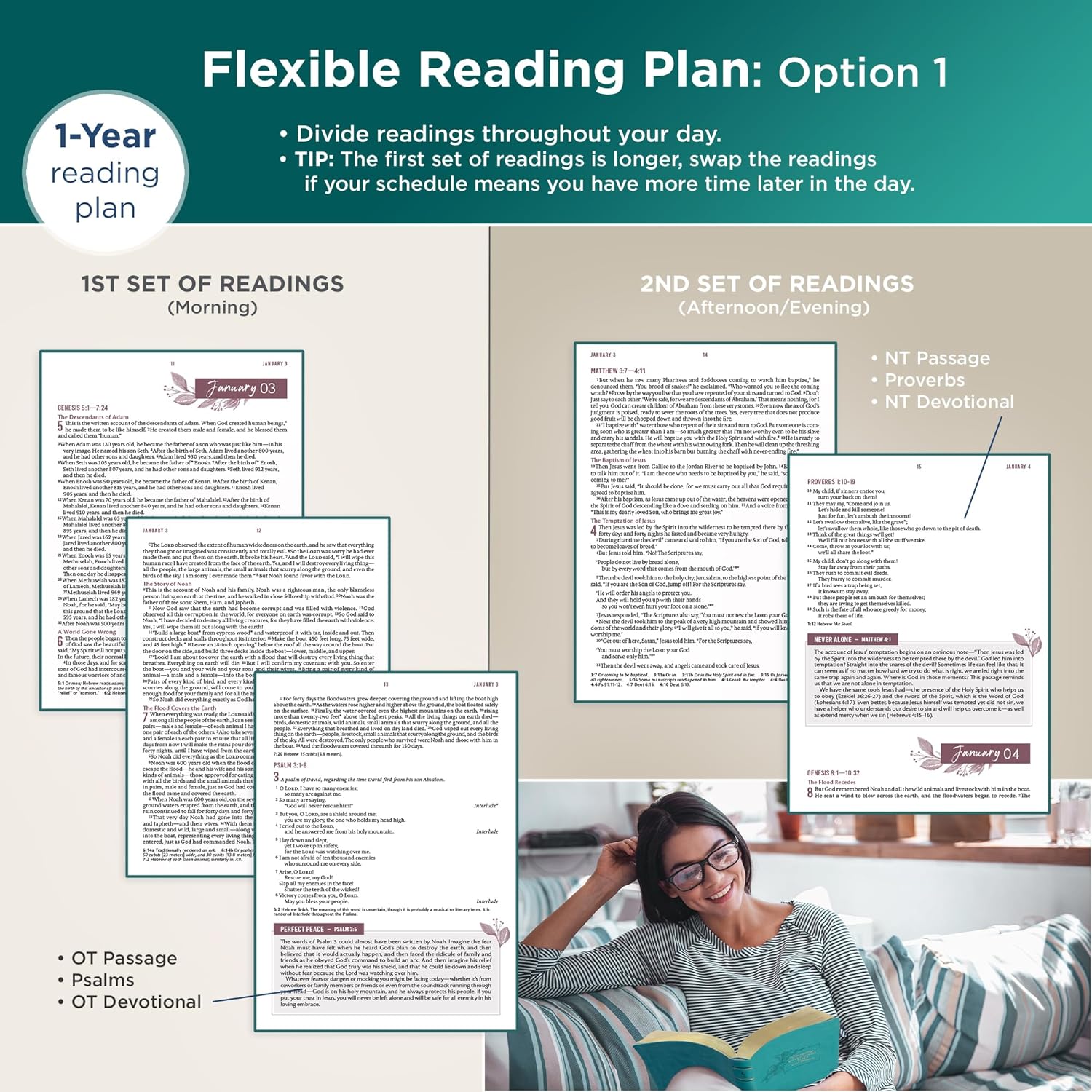 Daily readings incorporate passages from the Old and New Testaments, Psalms, and Proverbs. These are paired with 730 devotions by Nancy Taylor. Devotional topics are inspired by the Scripture passages and cover a wide variety of topics that include relationships, work, faith, family, and more.