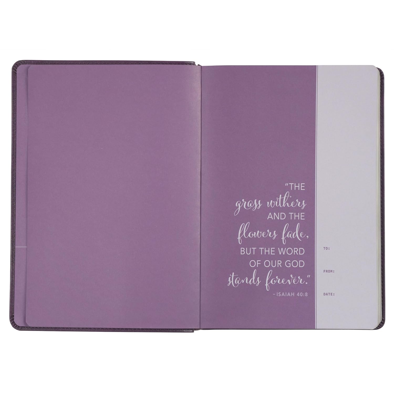 The front and back covers of the deep purple faux leather cover of the devotional Bible are heat-debossed with a frame that is accented with heat-debossed corner scroll designs.