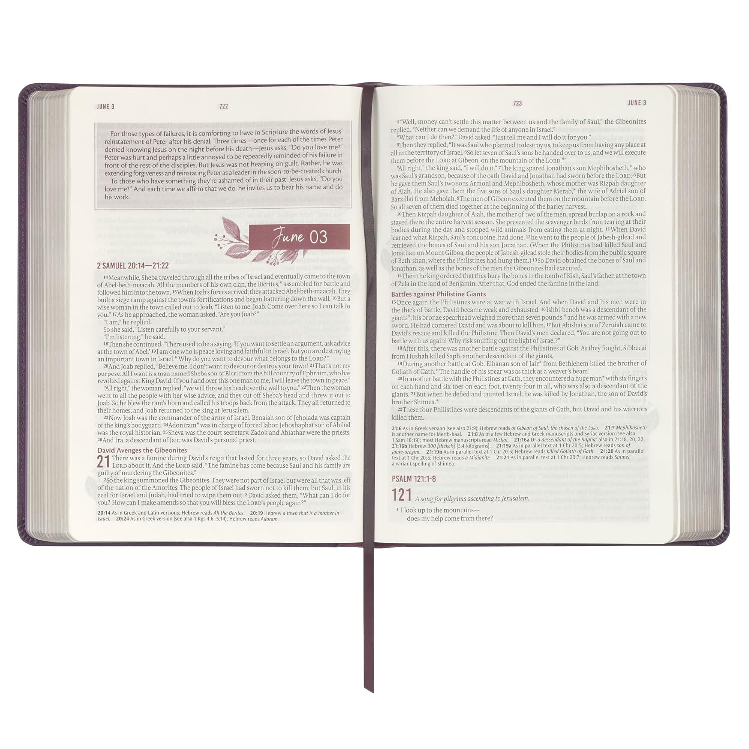 Cultivate the practice of daily Bible reading by dedicating a year to reading through the Framed Purple Faux Leather NLT Everyday Devotional Bible for Women. Within its pages, you'll discover daily Scripture readings paired with insightful devotional content by Nancy Taylor, providing a comprehensive approach to your daily devotional journey.