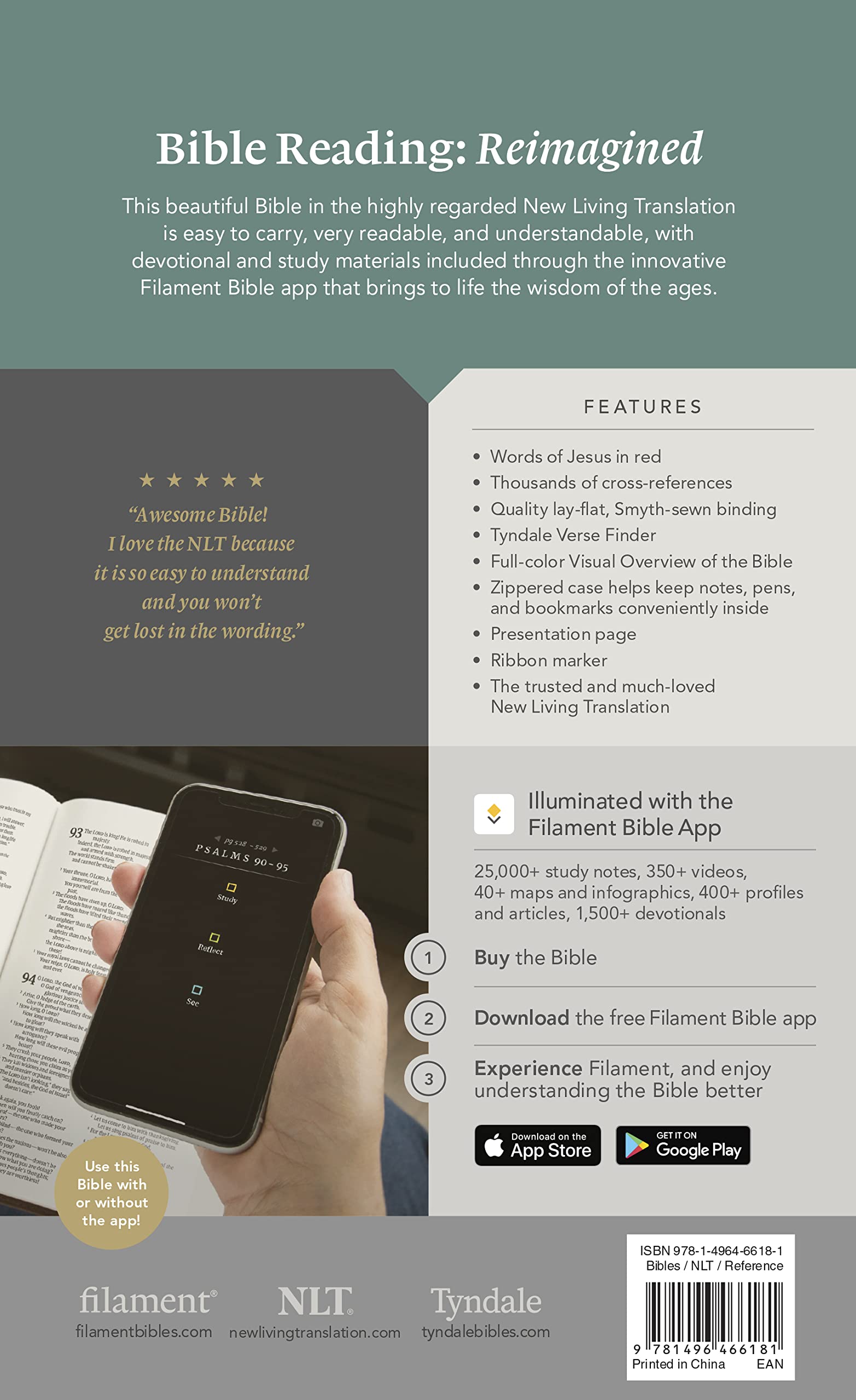 The new Tyndale classic NLT Thinline Reference Bible, Filament-Enabled Edition has readable text, an attractive layout, and cross-references in a thin, easy-to-carry size. And while it has the same low price as basic text-only Bibles, the NLT Thinline Reference offers much more. It not only features a bold new design and the trusted and much-loved New Living Translation (NLT) but also includes the groundbreaking Filament Bible app. This app enables you to use your mobile phone or tablet to connect every page to a vast array of related content, including study notes, devotionals, interactive maps, informative videos, and worship music.