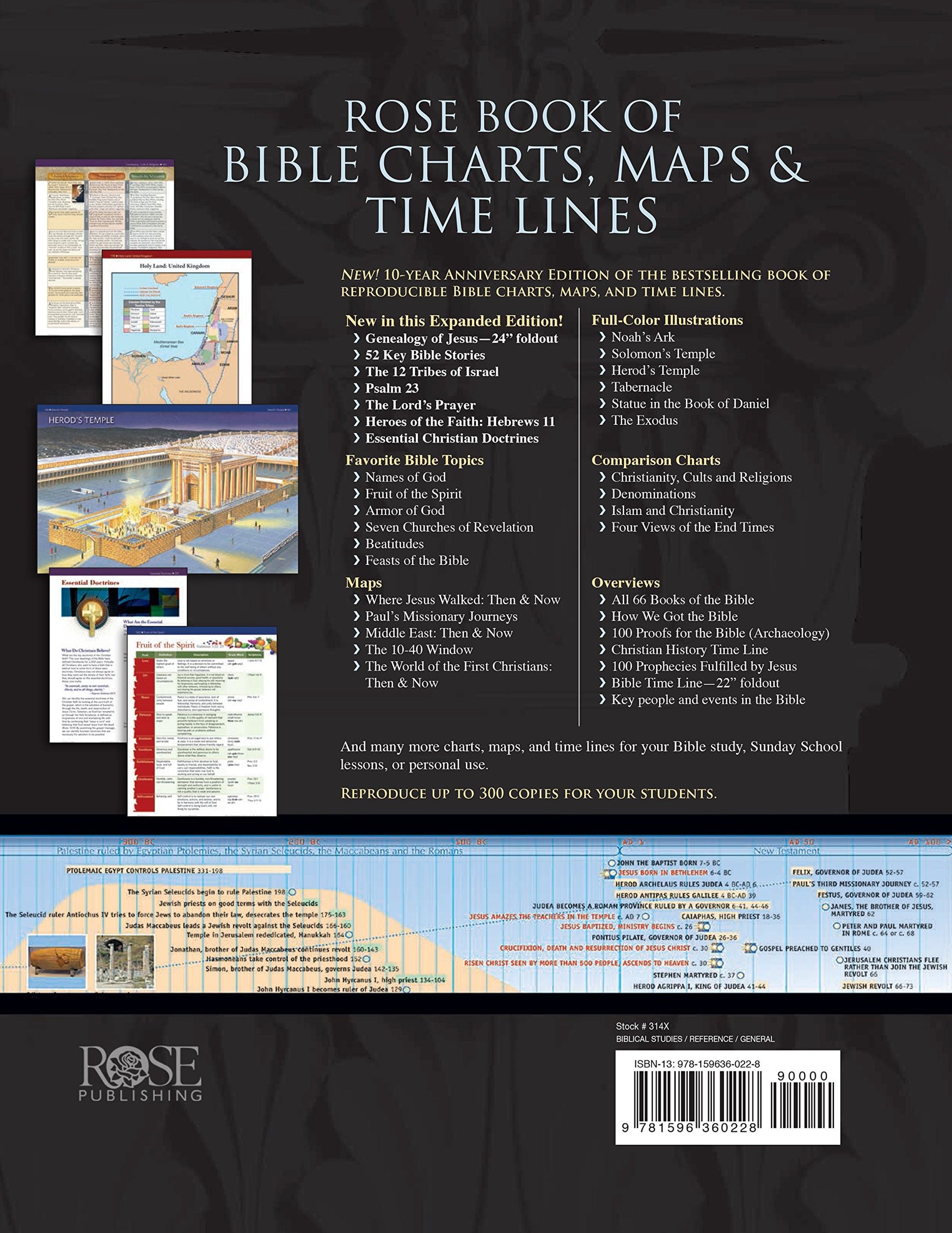 10th Anniversary Edition of Rose Book of Bible Charts, Maps and Time Lines features over 200 Bible Charts, Maps, and Timelines―and includes MORE pages, 6 EXTRA topics, updated information, and a bonus 24” fold-out on Jesus’ Family Tree.