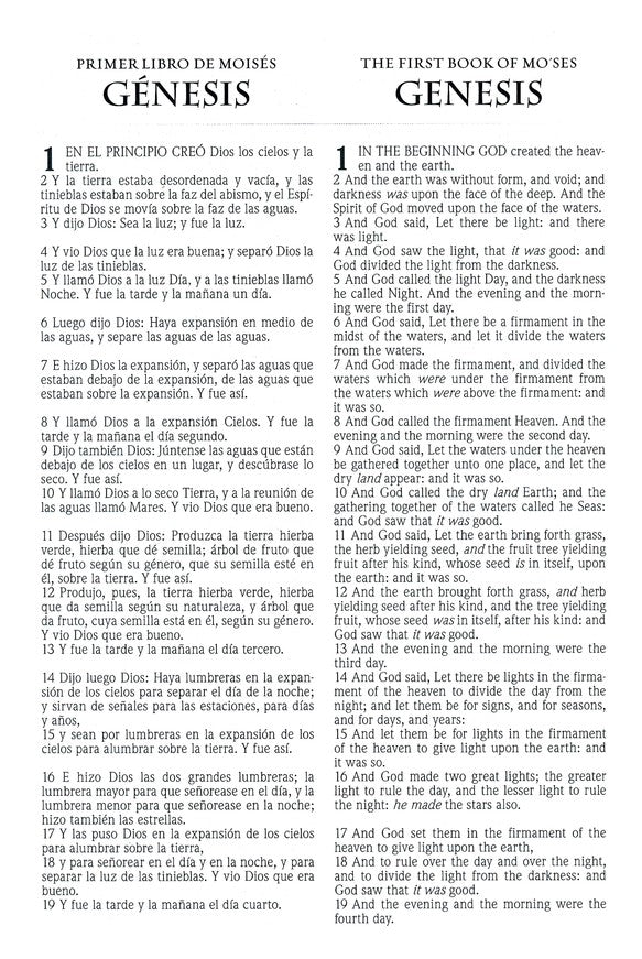 A bilingual Bible, Spanish and English, large print, that combines the elegance of the Reina Valera 1960 with the poetic beauty of the King James.