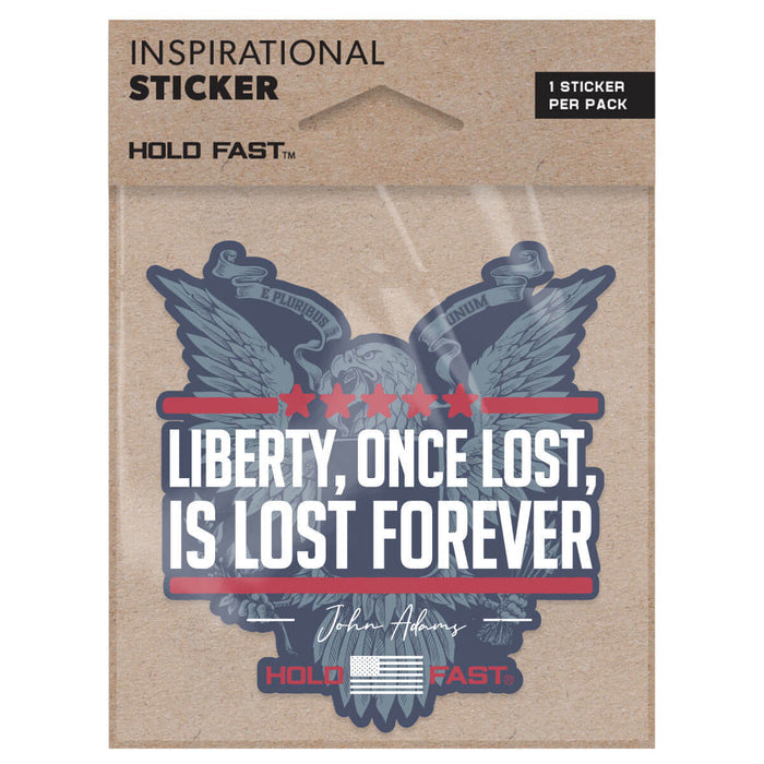 Cling to your freedom and defend it with this bold “HF Liberty Lost” Sticker by HOLD FAST®. Founding Father John Adams, America’s first vice president and second president, was also a leader of the American Revolution that achieved independence from Great Britain. His passion for the freedom fought and won by himself and his peers was incredible. This weather and fade-resistant sticker will look great on your car, laptop, or water bottle.