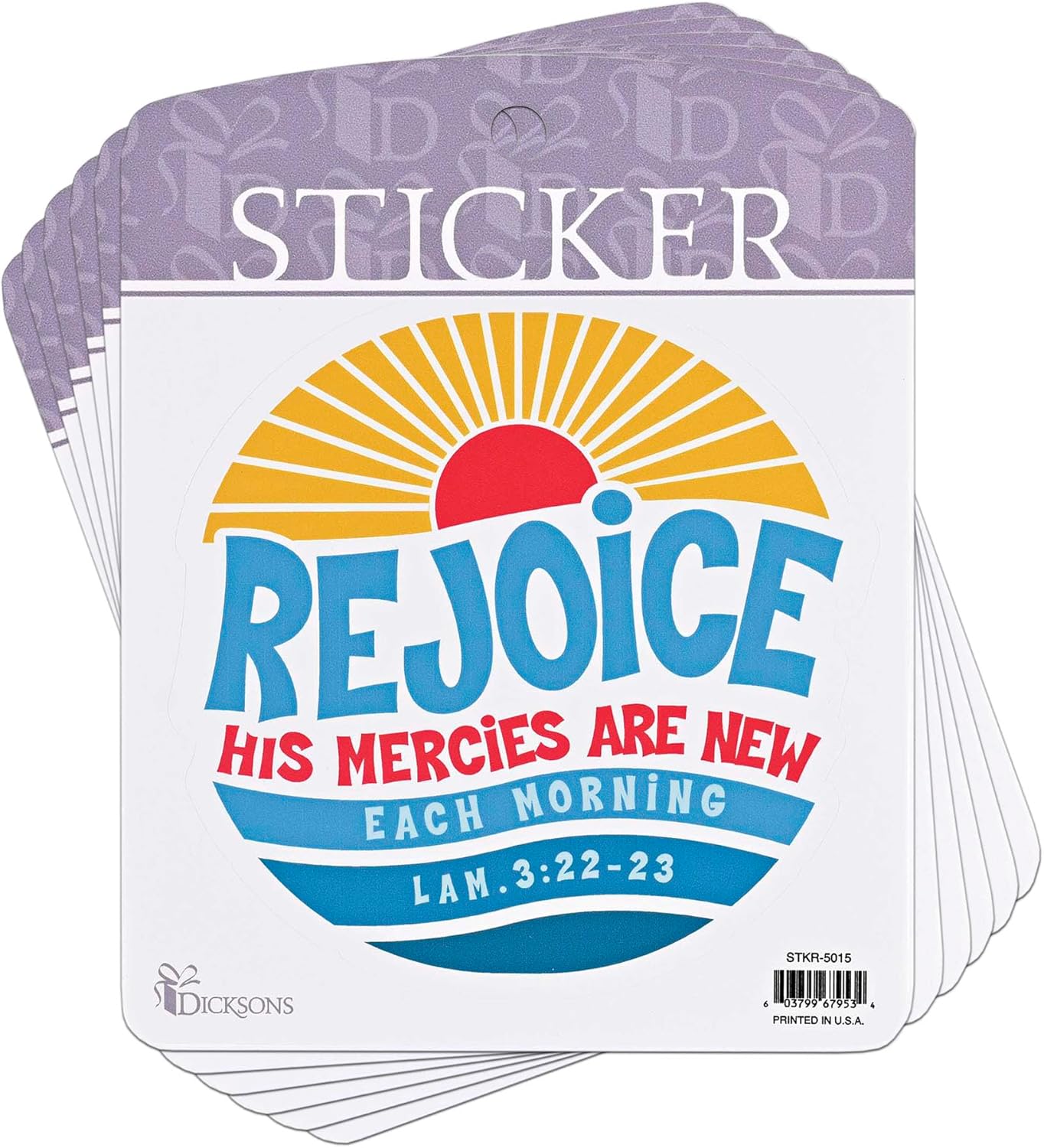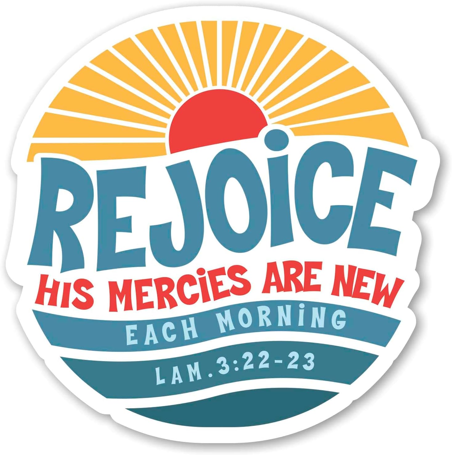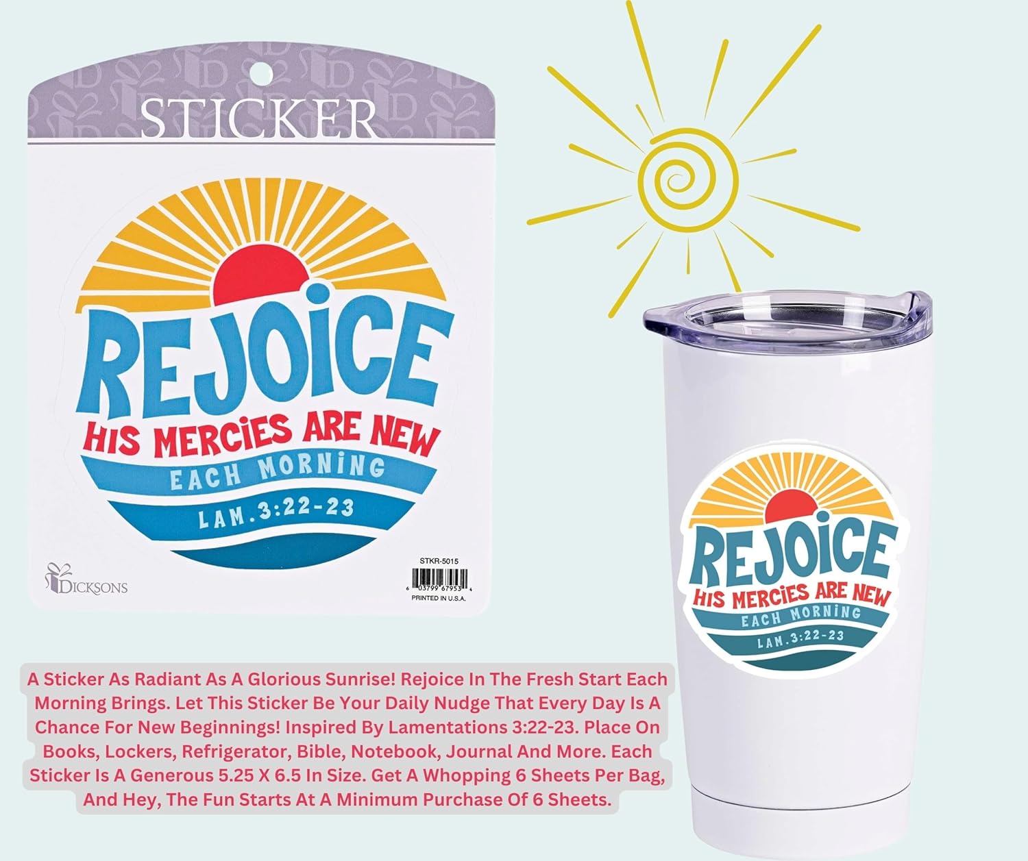 - Delight, encourage, and inspire with this decorative sticker that reflects your faith with grace and flair!; This fun piece features a glorious sunrise design with text "Rejoice His mercies are new each morning" - Lamentations 3:22-23
