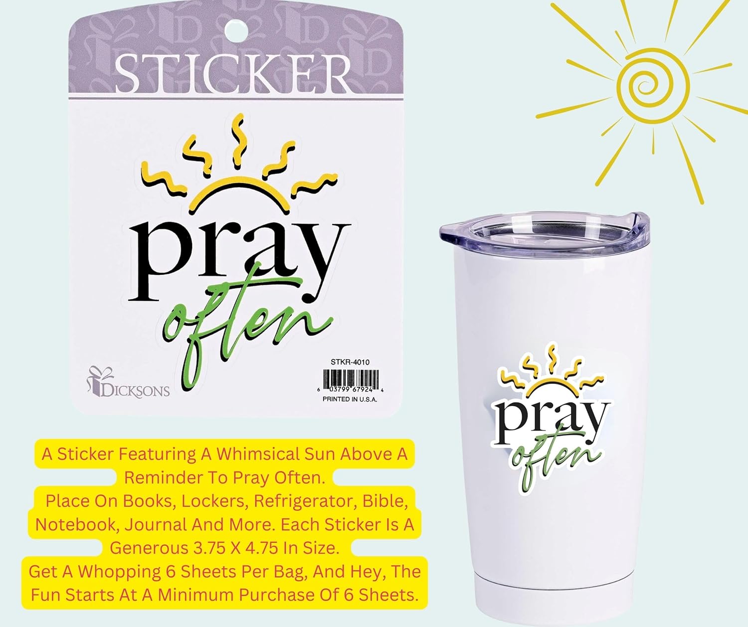 - Delight, encourage, and inspire with this decorative sticker that reflects your faith with grace and flair!; This fun piece features a sun design with text "Pray often"