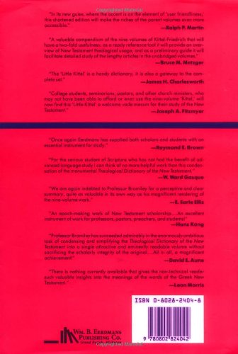 One of the most widely respected theological dictionaries put into one-volume, abridged form. Focusing on the theological meaning of each word, the abridgment contains English keywords for each entry, tables of English and Greek keywords, and a listing of the relevant volume and page numbers from the unabridged work at the end of each article or section.