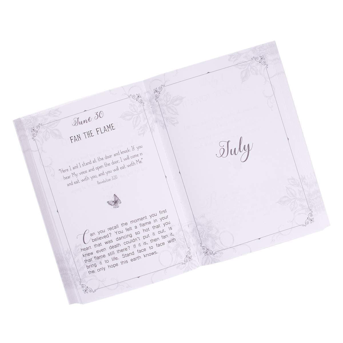 This small devotional softcover-bound devotional features a light blue cover decorated with a thing gold-foiled frame with corner scroll designs. A spot-varnished watering can overflowing with flowers and dotted with butterflies grace the cover and creates a delightful spring theme. The title is presented in thin black block letters and accented with gold-foiled scripted letters.