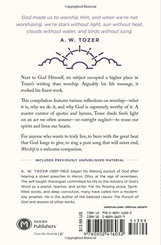 Worship: The Reason We Were Created features collections from the beloved spiritual writer on this important topic. The church's current worship is emaciated; its thoughts of God are too low. Here is a compilation to raise those thoughts high once more, and provoke the church to true, spiritual worship.